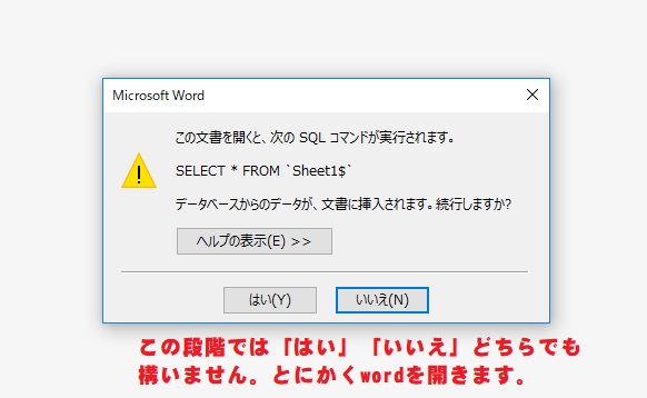 前回のデータベースが紐づけされていますので、下のような警告が表示されますが、時間がもったいないので「いいえ」を選択。※実際はどちらでも構いません。