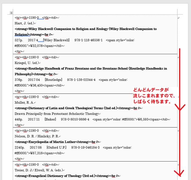 この文書をカテゴリーごとに選択して(1190-0などの注文番号から判断する)、洋書のホームページの「Booknews登録」<「新規登録」に張り付ける。