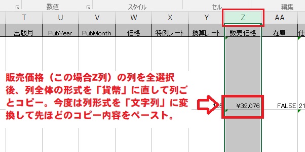 もう一か所、「販売価格」の列(この場合Z列)を全選択(Zをクリックするだけ)した後、右クリックでプロパティ表示→列全体の「セルの書式設定」を”通貨”に設定、再度右クリックで選択部分をコピー。メモ帳とかに張り付けておいてください。