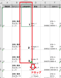 「注解書順序」の列(この場合C列)の最初に1、次に2を入れ、セルの右下をドロップして1,2,3,4・・・というように最後まで順列数字を入れます。