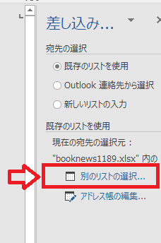 画面右に差し込み印刷のウィザードが開かれました。ウィザードに従って、「種類→名簿」、「宛先の選択→既存のリストを使用→別のリストの選択」をクリック。ここで別ウィンドウが開きます。