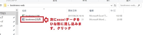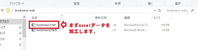 ウィンドウでデータソースのフォルダが開かれますが、booknews-webのフォルダに表示を切り替えて、先ほど加工したExcelファイルを開きます。