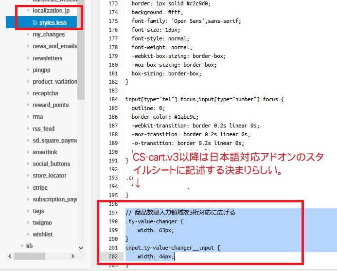 CSSで調整する必要があるが、どこに記述するか。基本はLESSだが、CS-cart.v3以降、ユーザー定義をlocarizationアドオンで規定するようにルールが決まったらしい。