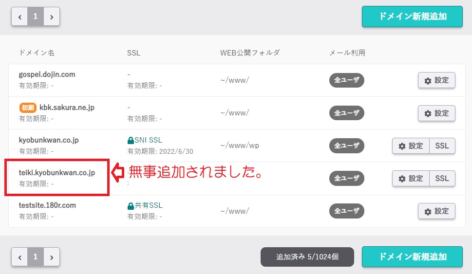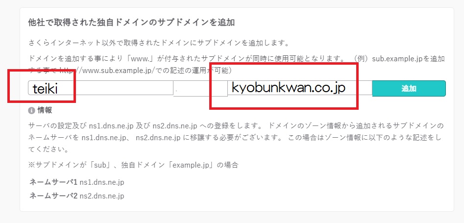上記の画面で、任意の好きなサブドメイン文字列(この場合はteiki)を記入。親ドメイン文字列を続けて記入し、追加ボタンをクリック。サブドメインの登録完了。