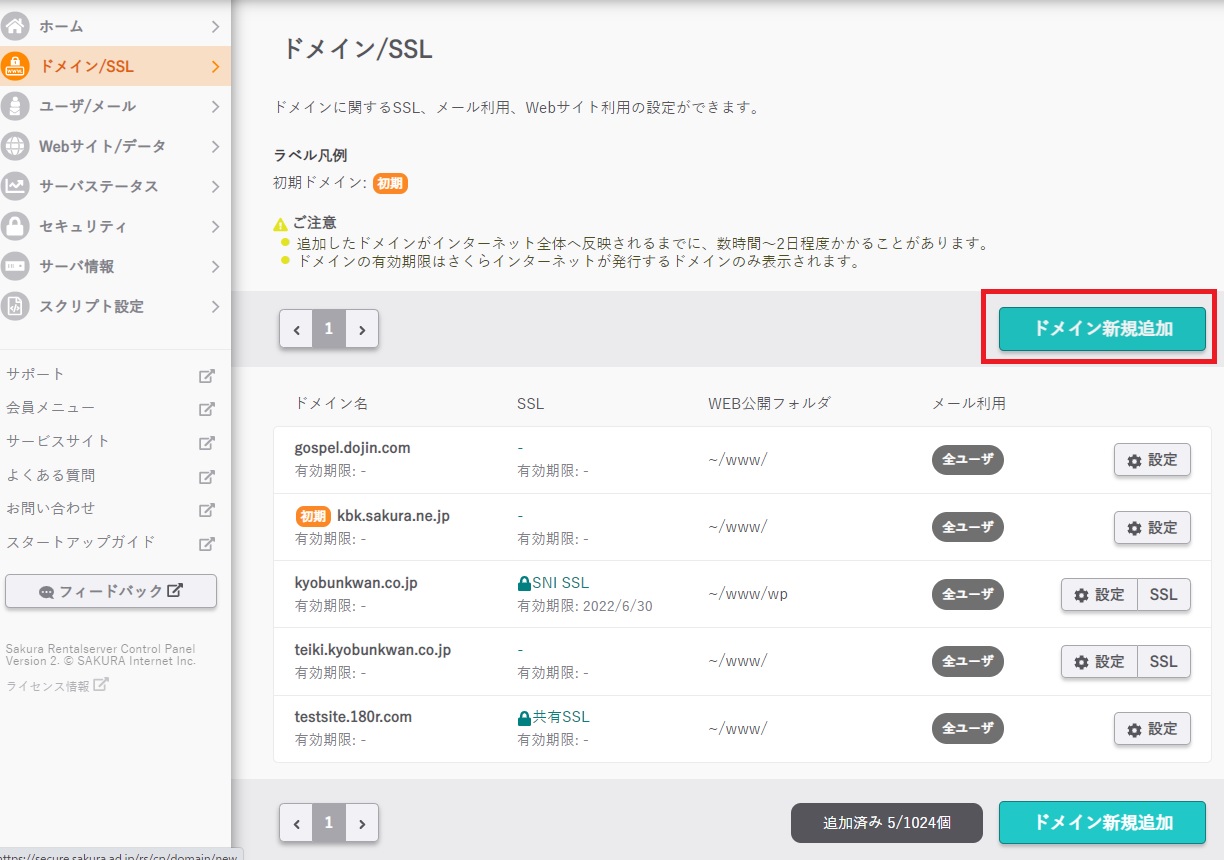 ①管理画面の「ドメイン/SSL」>ドメイン新規追加>他社で取得したドメインを移管せずに使う