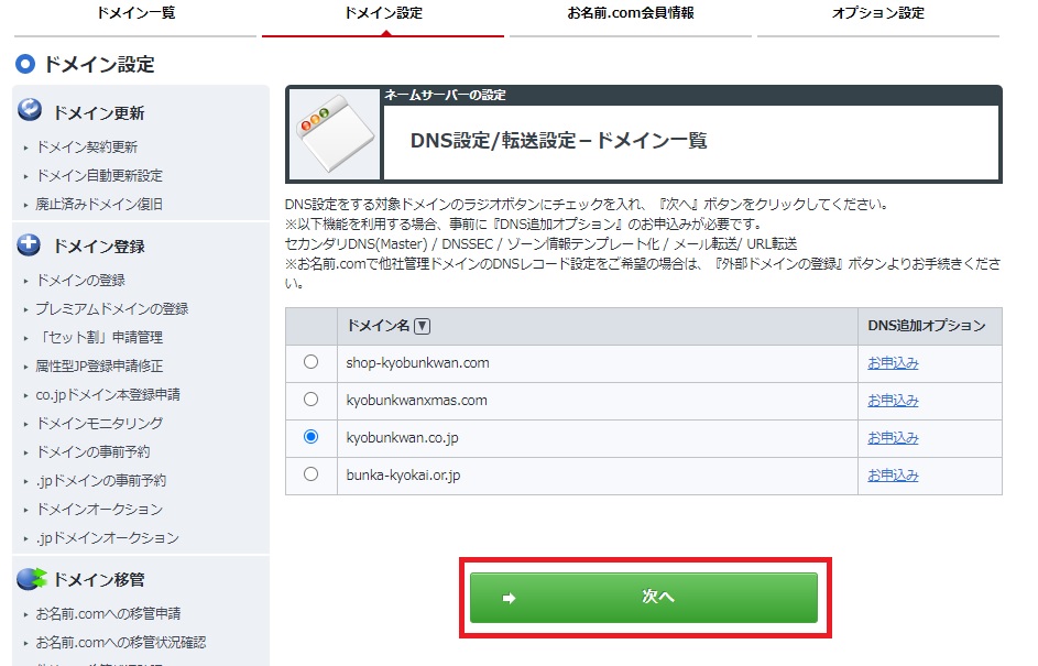お名前ドットコムにログイン後、「ドメイン契約更新」のページへ自動的に転送されますが、それは無視。グローバルメニューの「DNSネームサーバーの設定」→「ドメインのDNS設定」をクリック。サブドメインを設定したいドメインを選択した上で、「次へ」をクリックします。