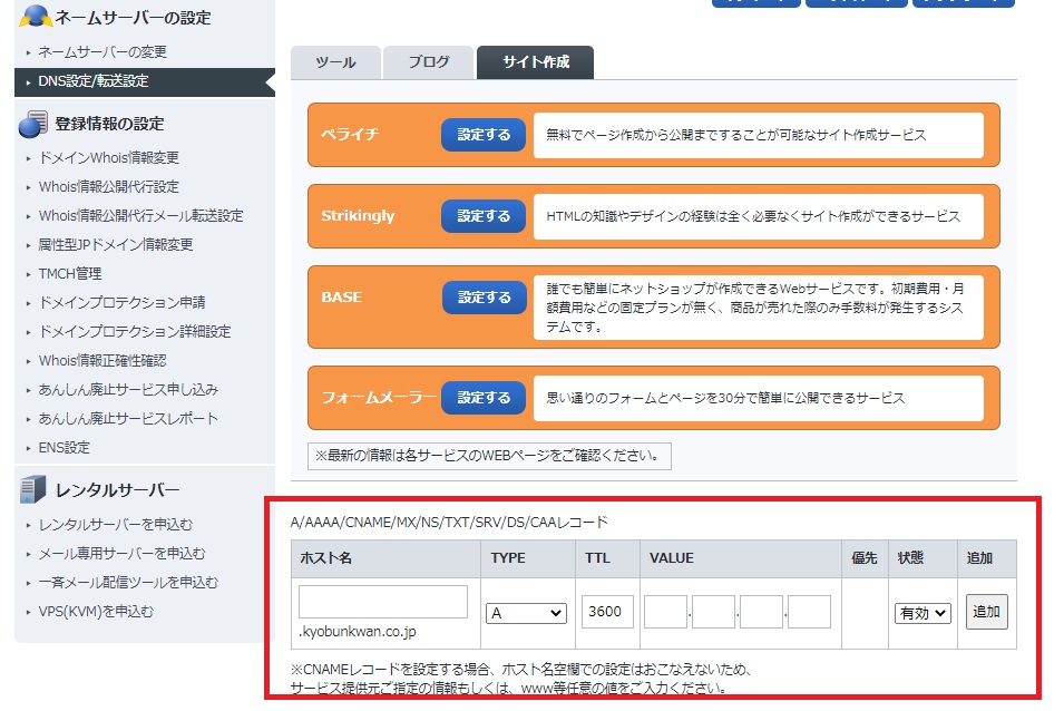 「DNSレコード設定を利用する」の「設定する」をクリックすると、DNSレコード設定のページへ行きます。少し下にスクロールすると下記のような画面に辿り着きます。