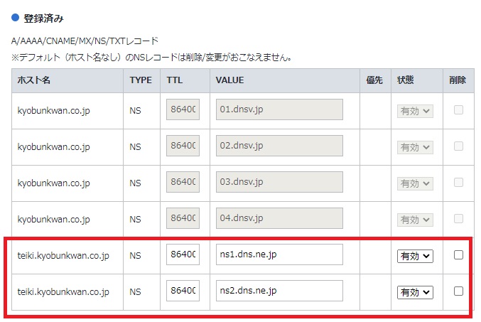 「TYPE」はNSを選択、「ホスト名」にはサブドメインで使いたい任意の文字を入れる(ここではteiki)。「TTL」はNSを選択すると値が86400に自動的に変わる。「VALUE」には