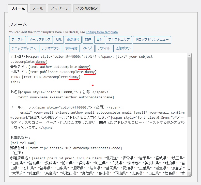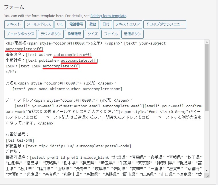 これにならって、コンタクトフォーム7上でも次のようにしてみました。ショートコード上なので、記述は”autocomplete:off”となっています。