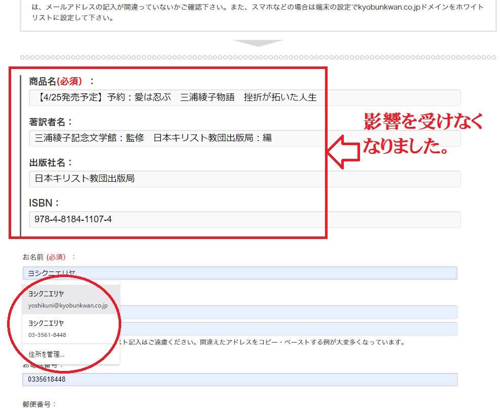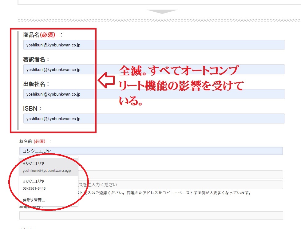 ブラウザにはオートコンプリート機能があって、ユーザーには便利なのですが、これが商品お問い合わせフォーム(Contact form7)では悪さをします。つまり、商品ページからすでにGETでパラメータを渡されてデータが埋まっている「商品名」「著訳者名」「出版社名」「ISBN」を上書きします。