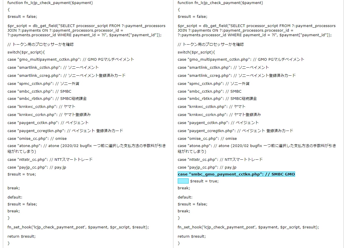 トークン用のプロセッサーかを確認する処理の中にSMBC・GMOを含ませる記述を書いているようです。(テキスト比較ツール difff《デュフフ》ver.6.1 を用いて比較)