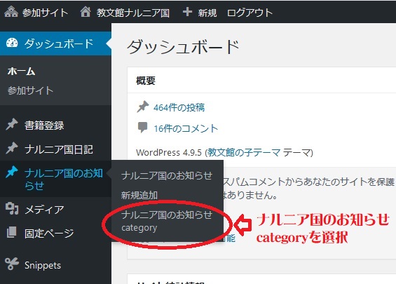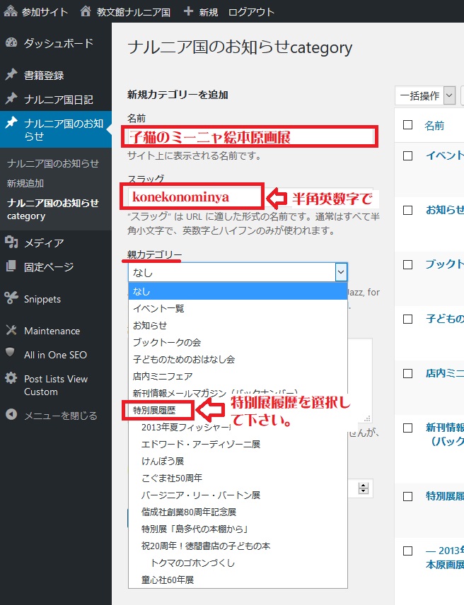 特別展催事の情報掲載は管理画面のサイドバーから、「ナルニア国のお知らせcategory」を選択して下さい。