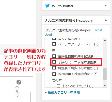 記事の作成画面で確認してみて下さい。下記の通り、カテゴリー一覧に追加されているのが確認できます。